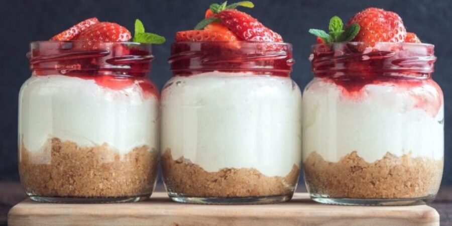 Para montar a cheesecake veg, vamos usar taças ou copinhos individuais. Coloque uma camada da base nas tacinhas, cubra com uma camada generosa do creme e, em seguida, finalize com a Geleia de Morango com Chia Superbom.